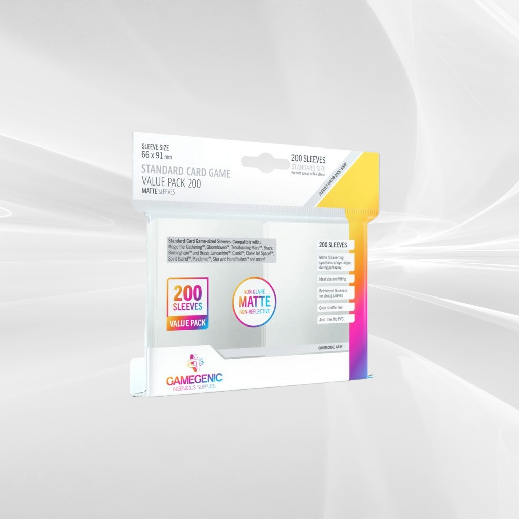 The Standard Card Game Value Pack includes 200 high-quality, standard-size Matte Sleeves, perfect for protecting large trading card decks or board game collections. Made to the same trusted standards as all Matte Board Game Sleeves, these sleeves feature a matte finish that reduces glare, keeping card text easy to read and helping prevent eye fatigue during long gaming sessions. With a durable 100-micron thickness, they add both weight and sturdiness, giving your cards reliable, professional-level protection.