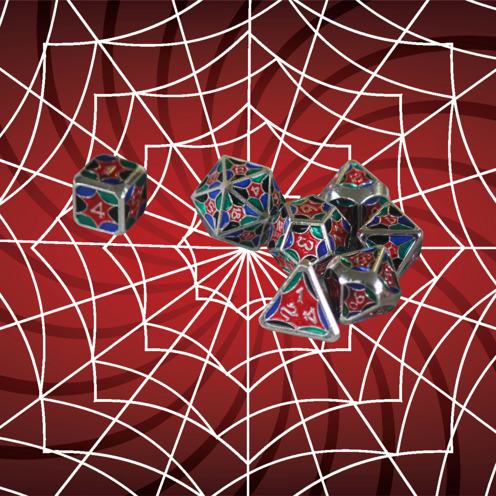 Cast in solid metal with an intricate spiderweb design, these dice bring a dark, elegant edge to your game. Weighty, durable, and precision-balanced, they deliver a satisfying roll and bold tabletop presence - perfect for RPG players who like their gear with a touch of menace.